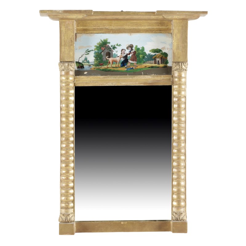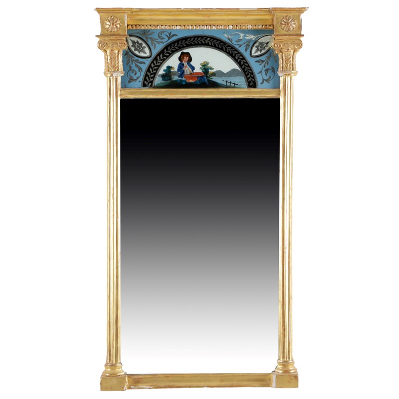 the rectangular plate flanked by columns and with a verre églomisé frieze, decorated with a man playing a pipe, together with another similar pier mirror (2)