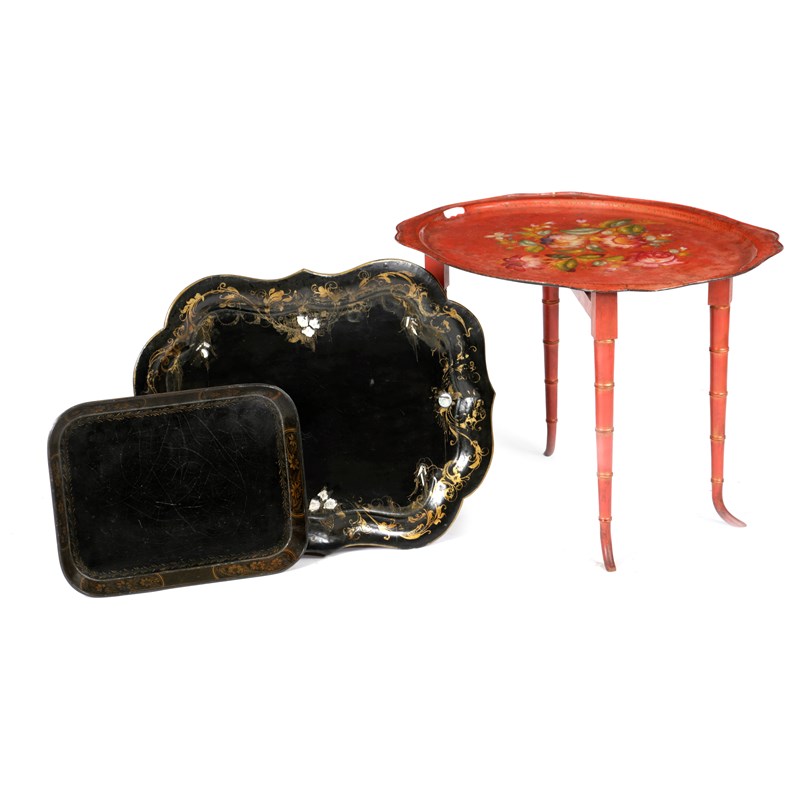 one by Clay with gilt borders and stamped 'Clay, King St. Covt Garden', the other inlaid with mother of pearl, each on an associated stand, together with a red tôle peinte tray on a folding faux bamboo stand and another papier-mâché tripod table (4)