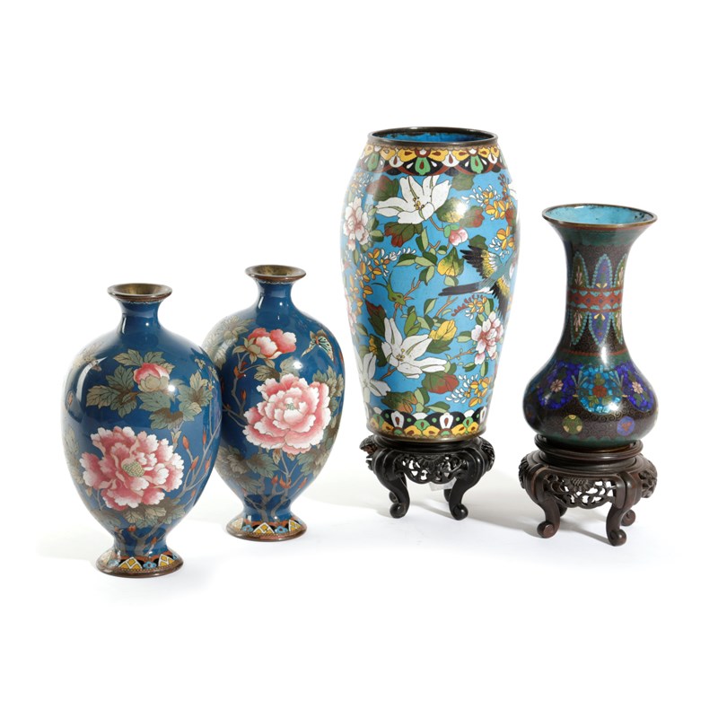 each decorated with butterflies and peonies, together with two other cloisonné vases, with two stands (6)