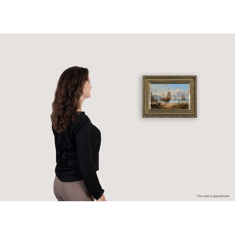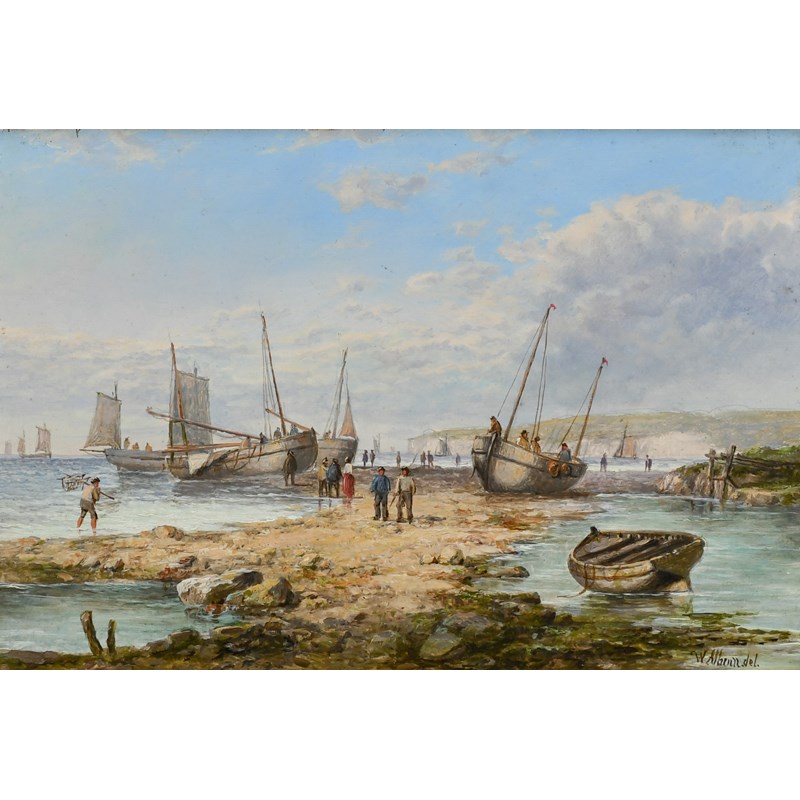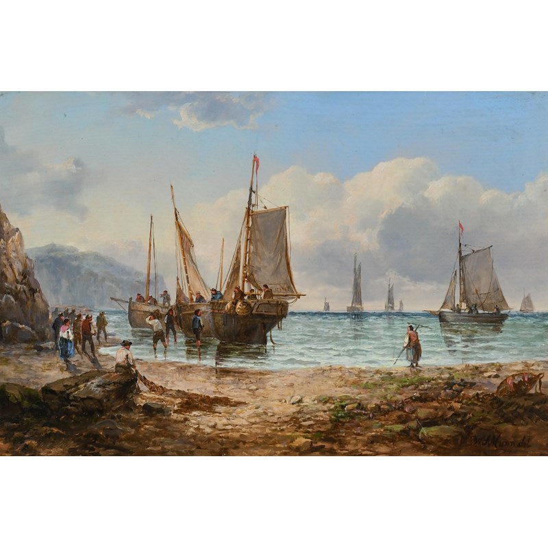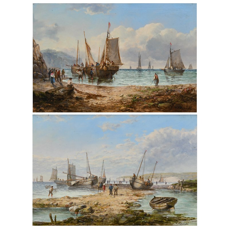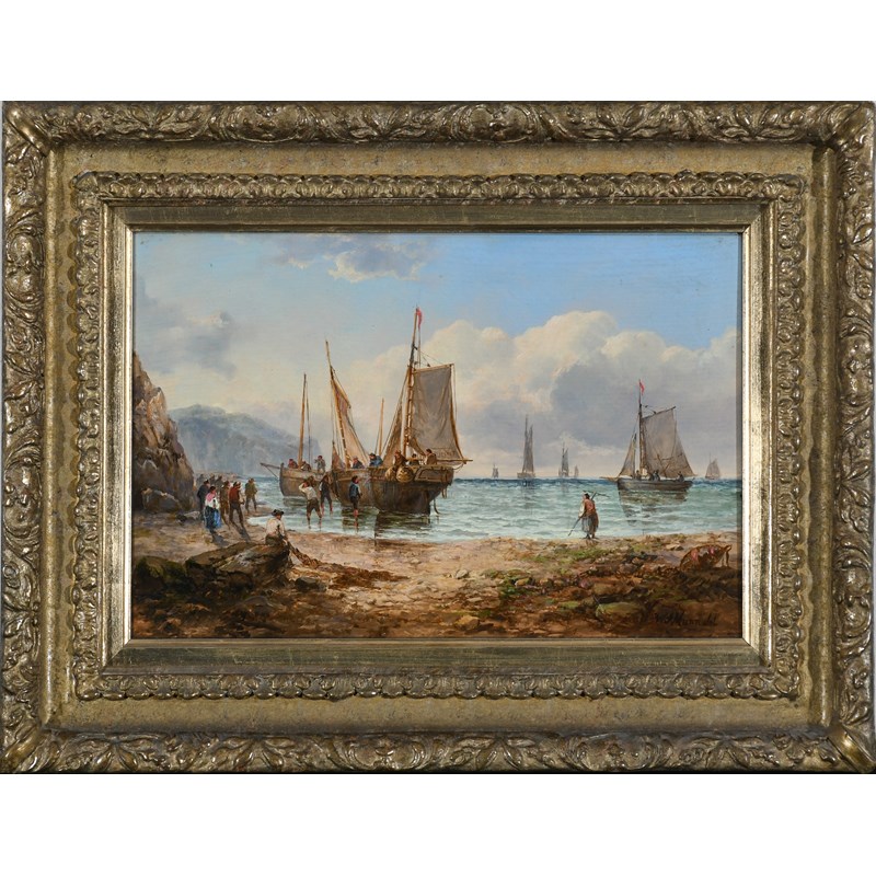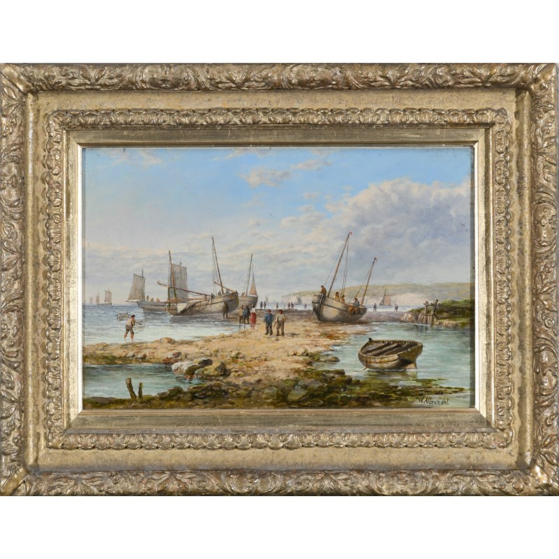 Coastal landscape with fishermen unloading the catch; Coastal landscape with beached fishing boats