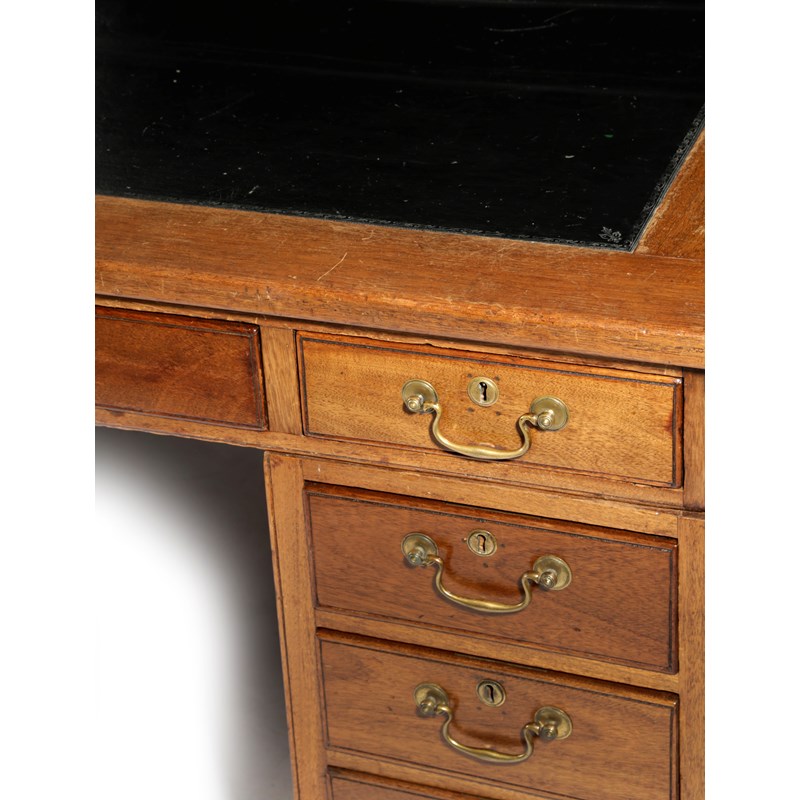 the top inset with black tooled leather above an arrangement of twelve drawers to either side