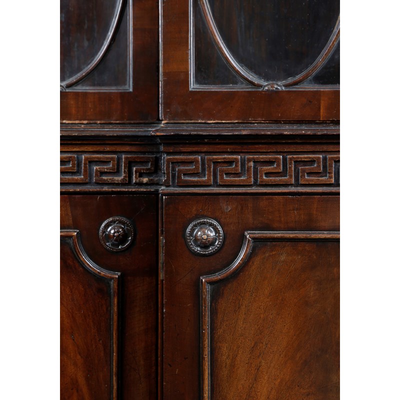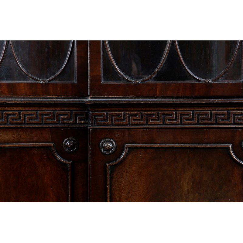 the blind fret detachable cornice above glazed doors with elliptical astragal mouldings enclosing adjustable shelves, the base with cupboard doors with outline mouldings