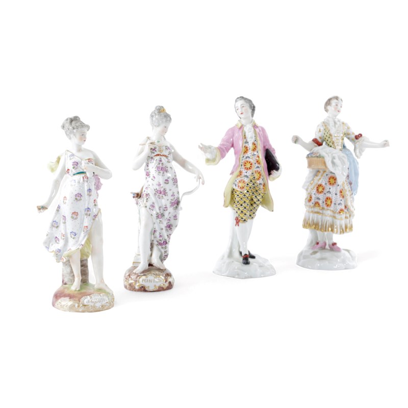 each in the form of a classical maiden standing on a titled base 'Peinture' and 'Jalousie', together with a pair of Samson porcelain figures in Chelsea style each with gold anchor marks (4)