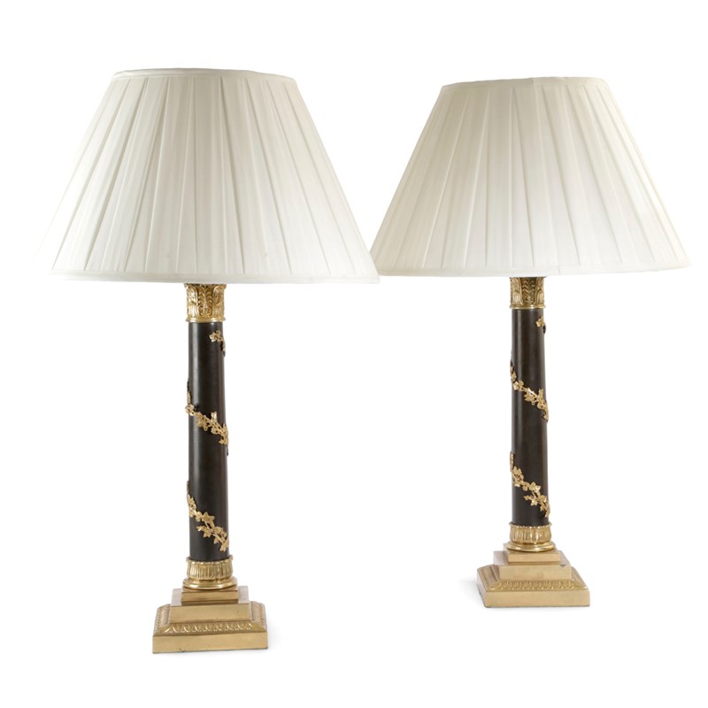 A PAIR OF GILT BRASS AND PATINATED TABLE LAMPS