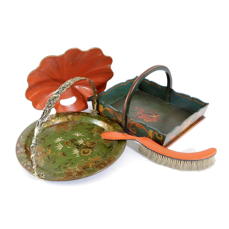 decorated in gilt with flowers and with a foliate cast brass swing handle, stamped 'Clay King St. Covn Garden', together with a papier-mâché crumb scoop and brush, a painted wood basket and a tôle cutlery tray (5)