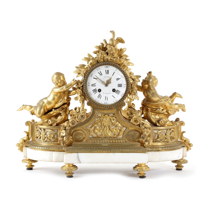 A FRENCH ORMOLU AND WHITE MARBLE MANTEL CLOCK IN LOUIS XV STYLE