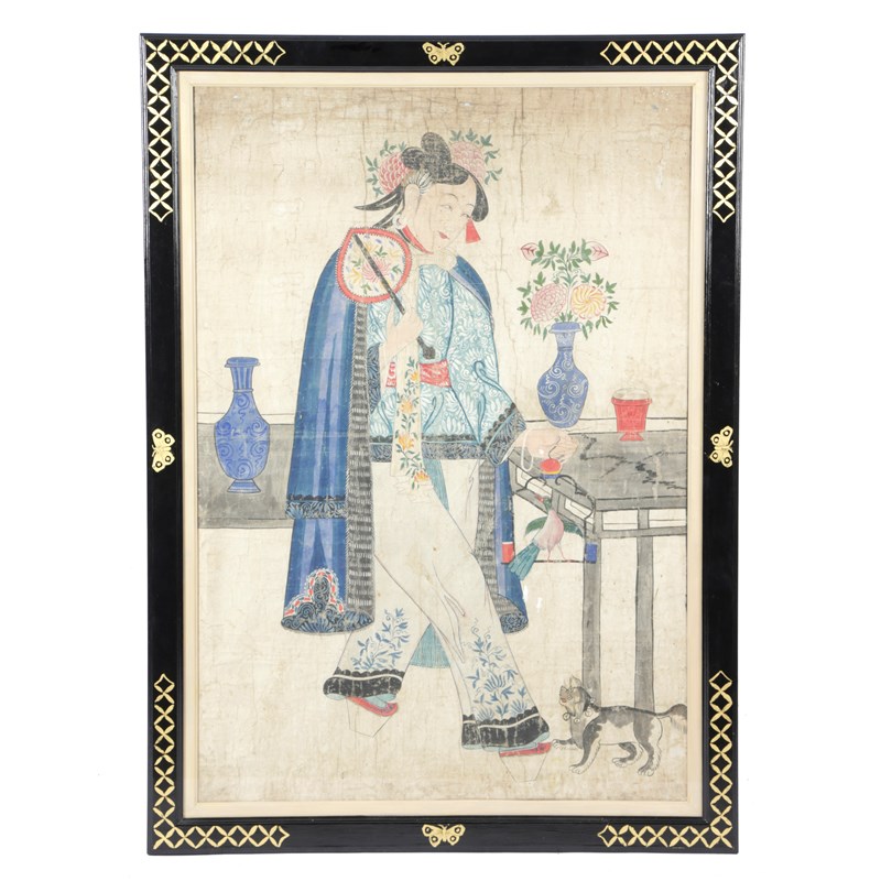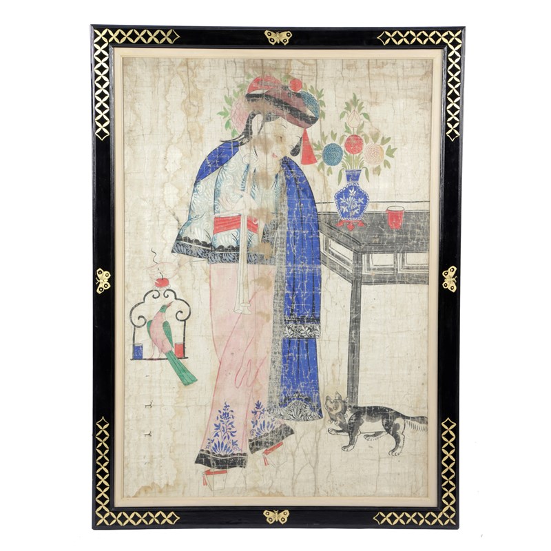 each depicting a lady in an interior scene holding an exotic bird in a cage and accompanied by her faithful dog, each in a later glazed gilt and ebonised frame (2)