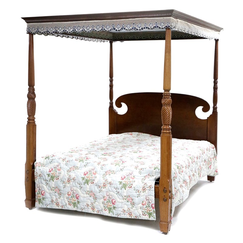 with a dentil cornice and a pleated silk canopy and lacework and silk border, with turned and spiral ribbed front posts and a scroll headboard