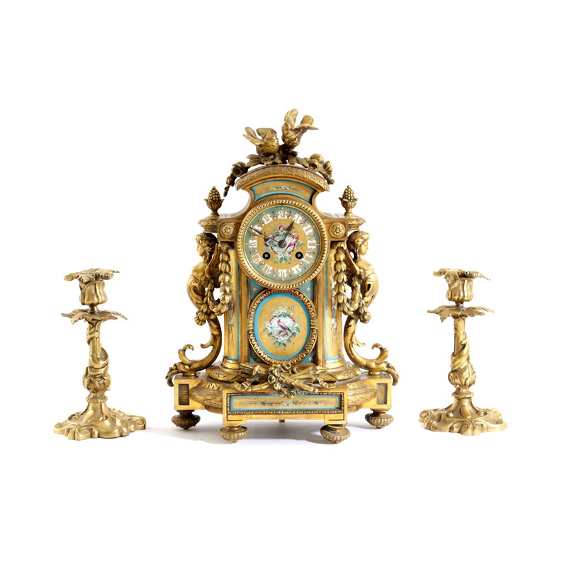the brass eight day movement by Japy Freres, numbered '625', striking on a bell, the circular dial with Roman numerals, the classical case decorated with female caryatids, love birds and war trophies, the painted panels by 'Cornibert Paris', finely painted with birds, together with a pair of associated gilt bronze candlesticks (3)
