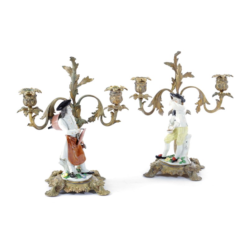 A PAIR OF GILT BRONZE AND PORCELAIN CANDELABRA