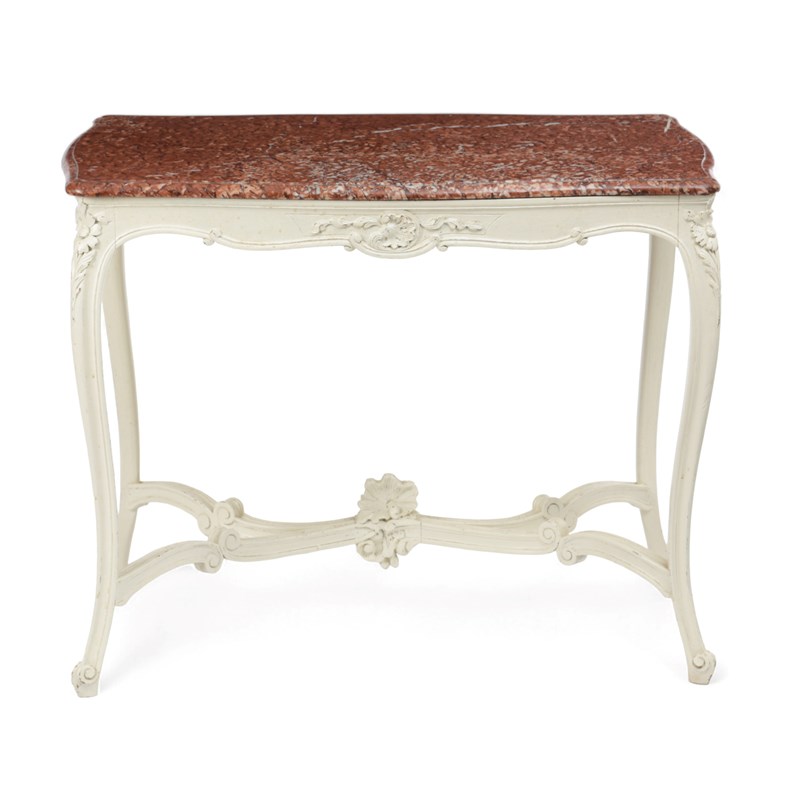 the serpentine rouge griotte marble top above cabriole legs united by a 'C' scroll stretcher