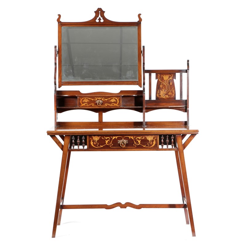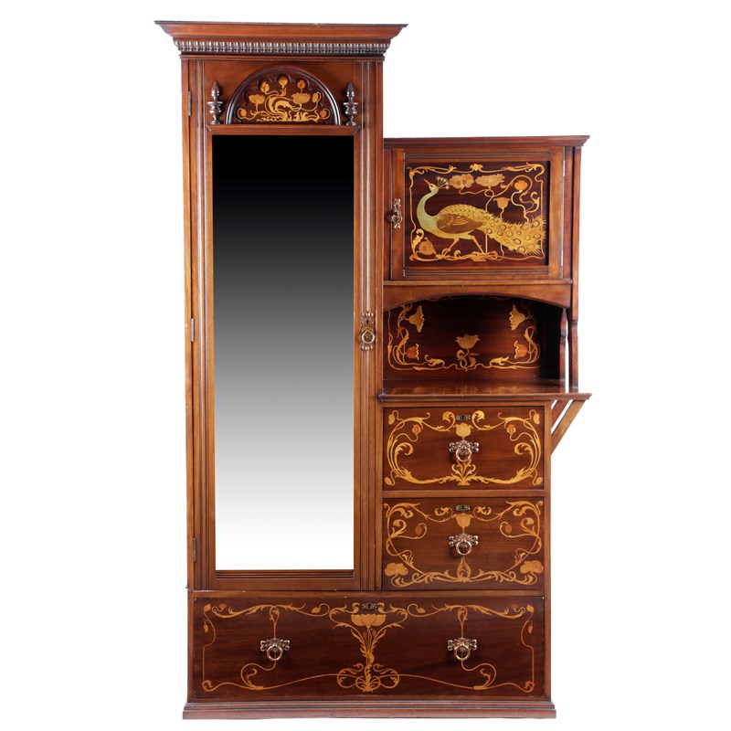in the Art Nouveau style, comprising: a dressing table inlaid with scrolling leaves and flowers and with a bevelled mirror and fitted with two drawers with copper handles, together with a single wardrobe with a bevelled mirror door enclosing hanging space, a cupboard decorated with a peacock and two short and one long drawer, each with a trade label inscribed 'Graham & Morton, Stirling' and with a metal registration label numbered 'RD 241158, Raleigh' (2)