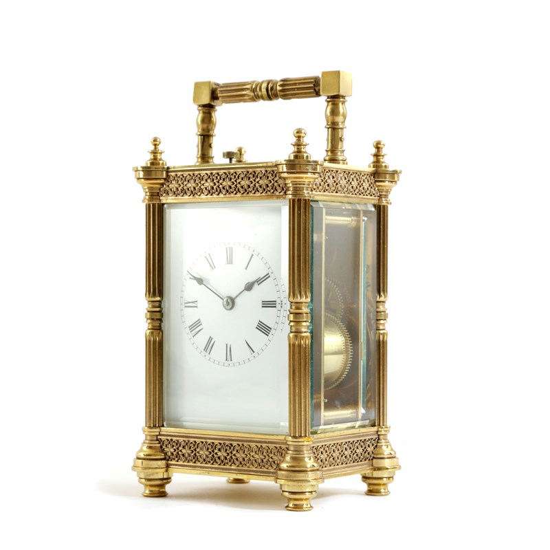 the brass repeating movement with a platform lever escapement and striking on a gong, the white enamel dial with Roman numerals, the case with ribbed columns and bevelled glass panels
