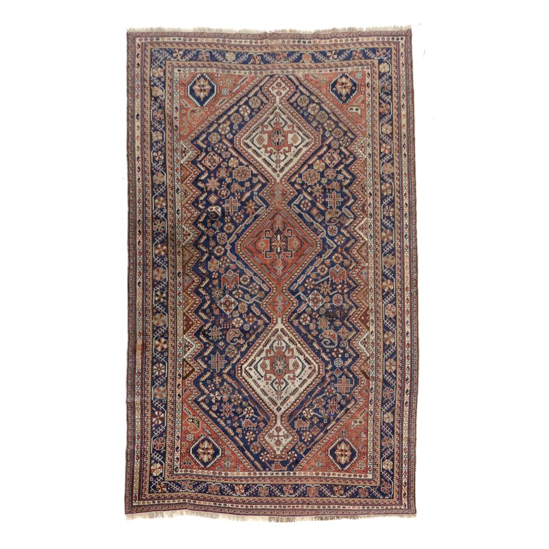 the deep indigo field with three stepped diamond medallions surrounded by tribal and zoomorphic motifs framed by pale madder spandrels and indigo angular latch hook and vine borders flanked by multiple guard stripes