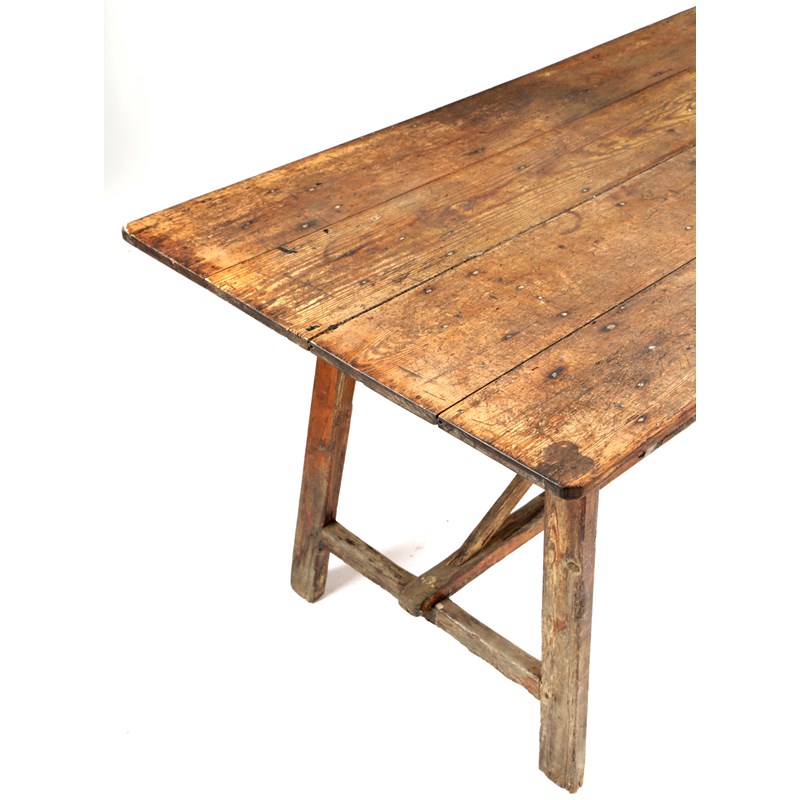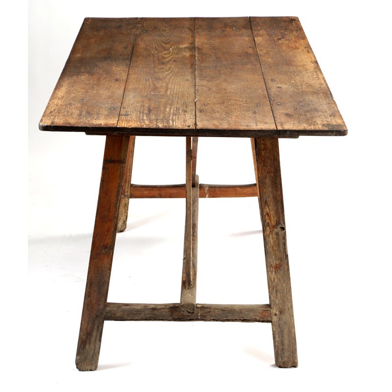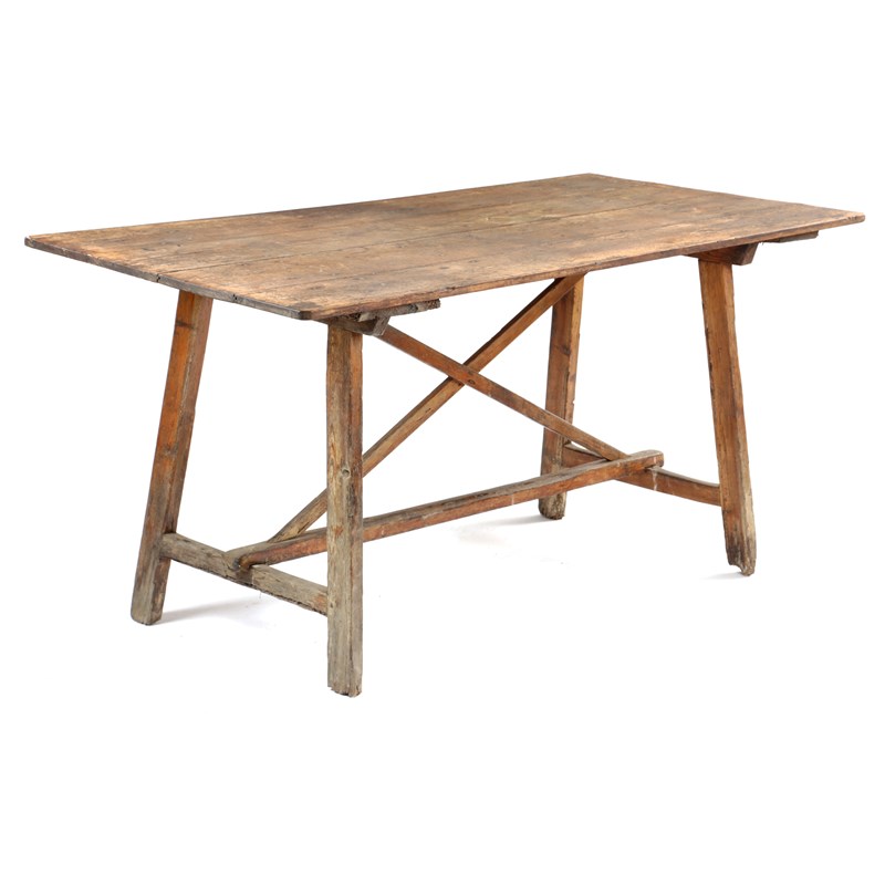 the boarded top on open trestle ends united by an 'X' stretcher