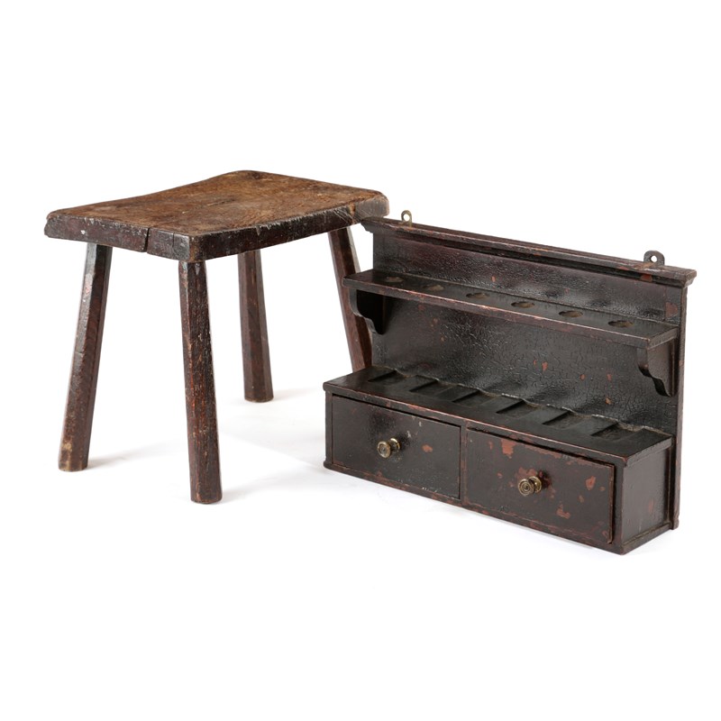 together with a folk art painted pipe rack, with apertures for six pipes above two drawers (2)