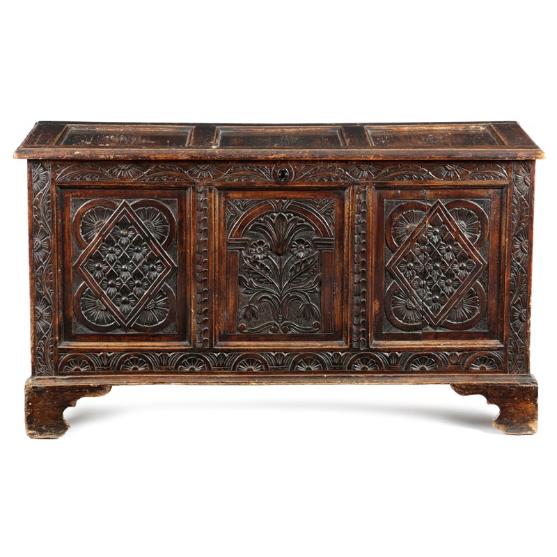 A FRUITWOOD TRIPLE PANELLED COFFER