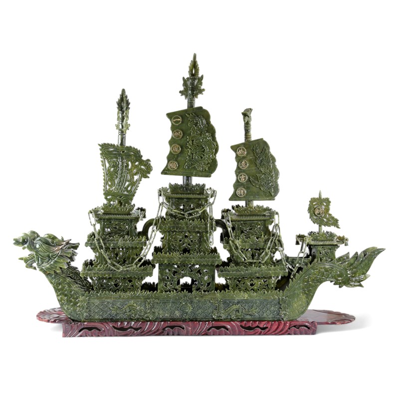 A MASSIVE CHINESE HARDSTONE MODEL OF A DRAGON BOAT