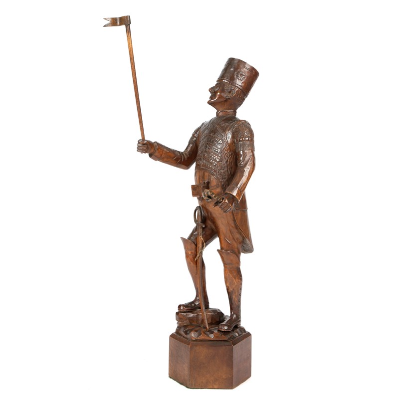with finely carved details to his hat with detachable plumage and military uniform, he stands on a rocky base holding a sword and flag standard