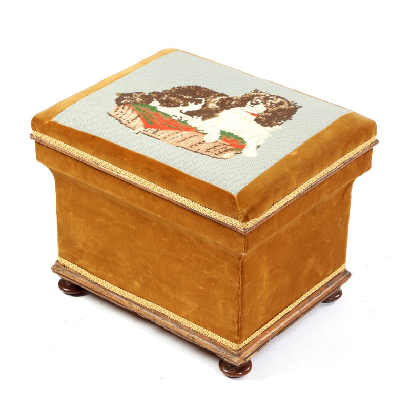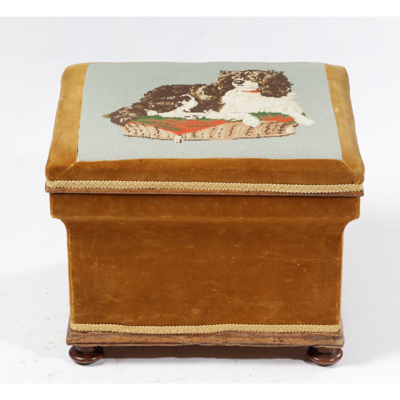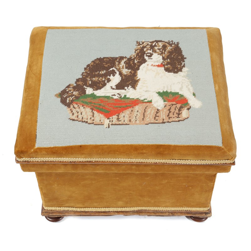 the hinged lid with a needlework panel of a recumbent spaniel on a cushion
