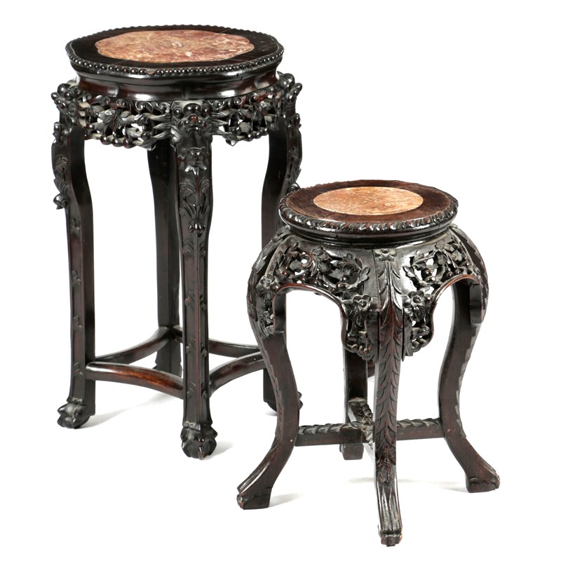 the top inset with a marble panel, carved with leaves and fruit on mythical beast legs, together with another Chinese stand (2)