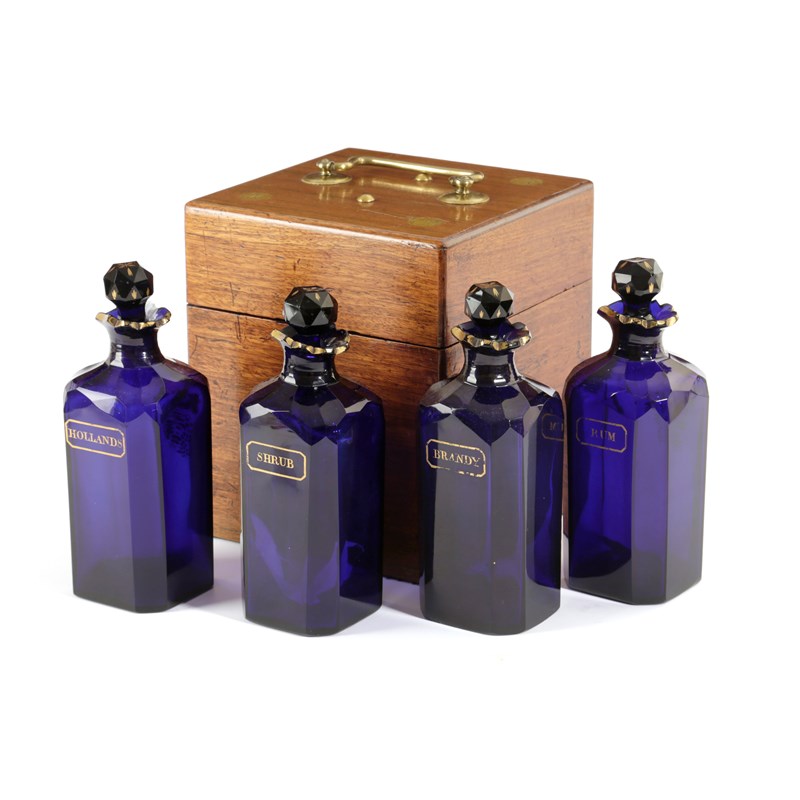 the hinged lid with a brass handle and inset with four circular plaques engraved with initials 'B R H S', the interior with four divisions fitted with Bristol blue glass decanters and stoppers with gilt highlights and named 'Brandy, Rum, Hollands, Shrub', with a dipped centre to hold a stopper when the decanter is in use, one with a Mallett Antiques price label for £2,950