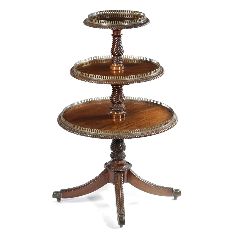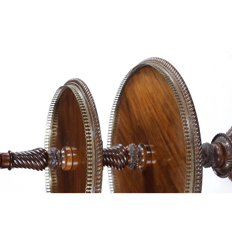 with three graduated revolving tiers, each with a brass gallery and gadrooned mouldings, the spiral fluted stem decorated with wreaths on foliate carved legs and brass castors