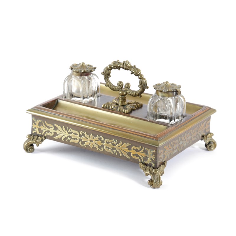 A WILLIAM IV FRUITWOOD AND BRASS MARQUETRY INKSTAND