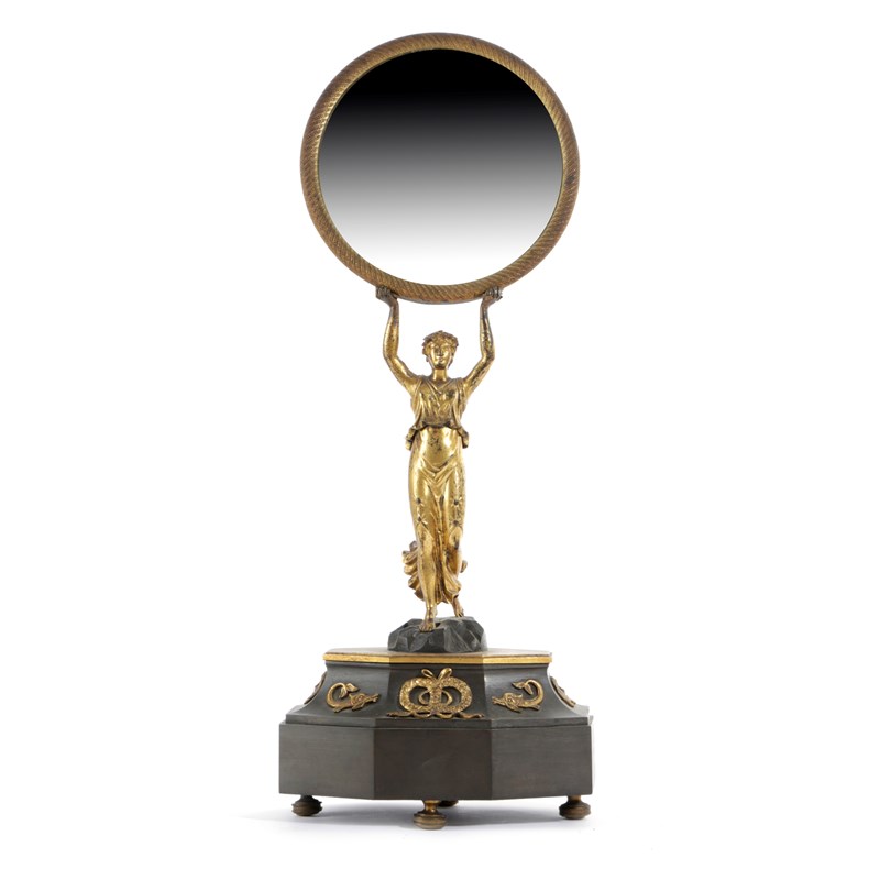 A FRENCH 'EMPIRE' GILT AND PATINATED BRONZE DRESSING TABLE MIRROR