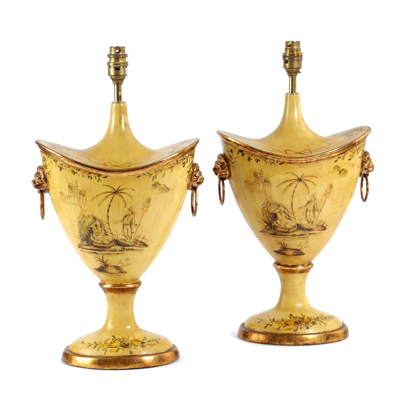 A PAIR OF TABLE LAMPS IN THE FORM OF 'TÔLE PEINTE' CHESTNUT URNS