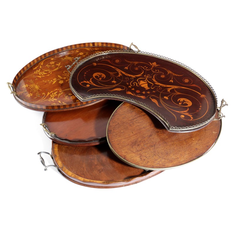 including: a George III mahogany and satinwood banded example, with a wavy edge laminated gallery inlaid with boxwood stringing and with plated handles and two late Victorian marquetry trays (5)