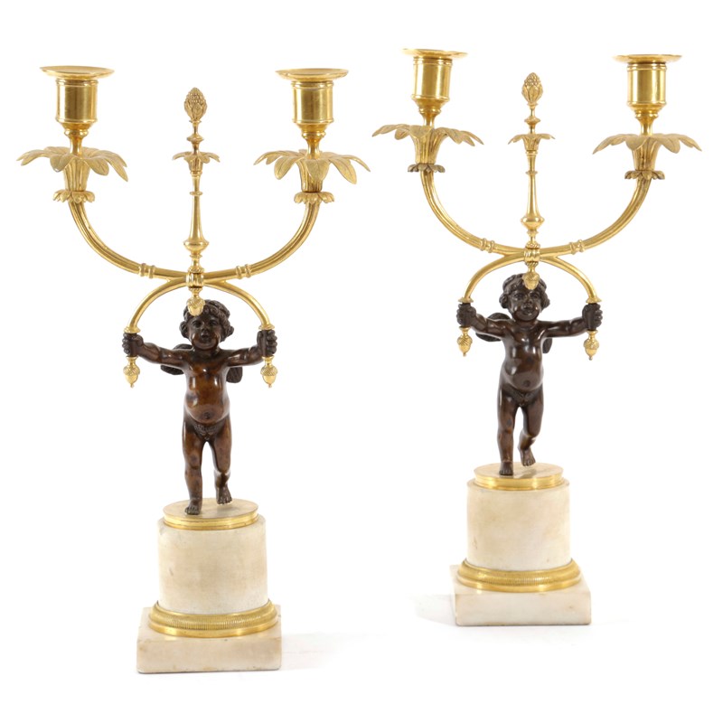 each in the form of a winged cherub supporting twin foliate branches and urn-shaped nozzles on a white marble pedestal (2)