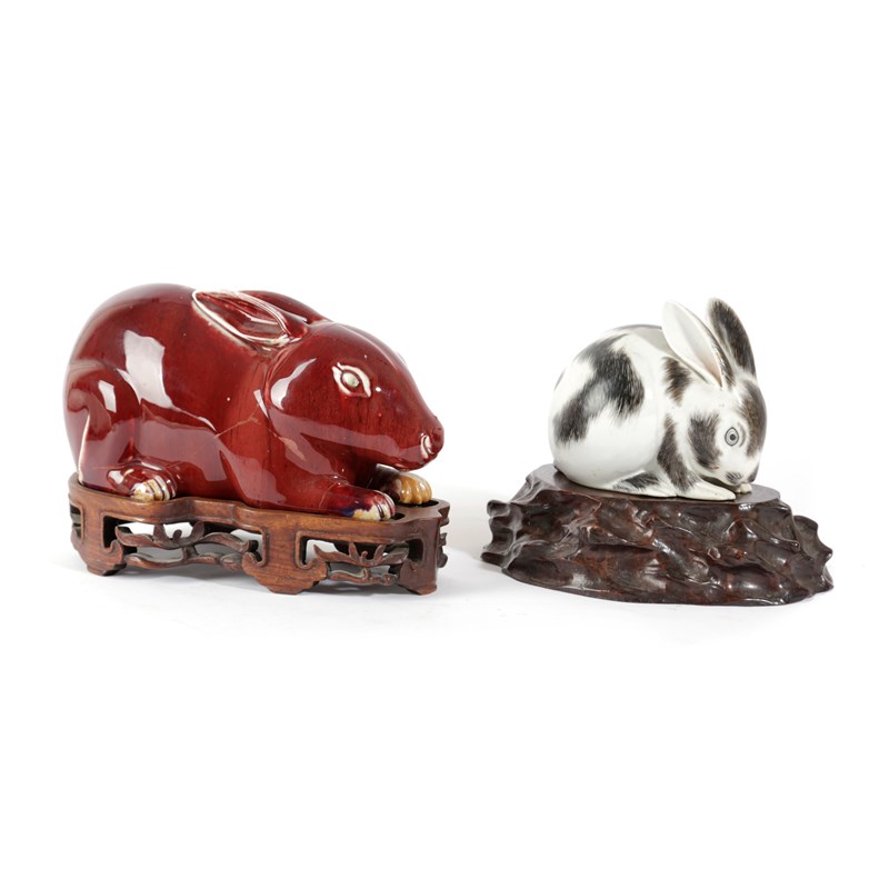 with a sang de boeuf glaze, damages, with a pierced hardwood stand together with a Japanese porcelain model of a rabbit, and a stand (4)