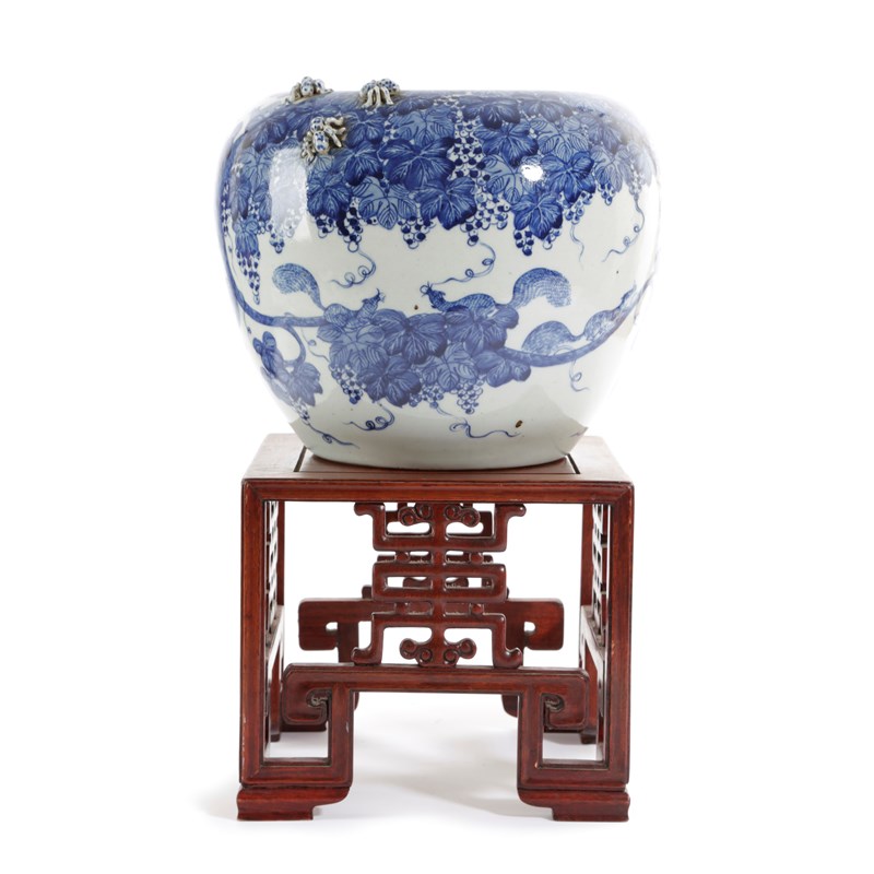applied with spiders and painted with squirrels clambering on wisteria branches, together with a Chinese hardwood stand (2)