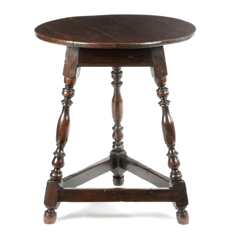 the circular plank top on three ornate baluster turned splayed legs, joined all round by plain stretchers
