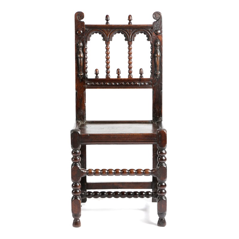 the back top rail of three arches, each carved and punched-decorated with a scalloped lower edge, raised on ring turned spindles, the lower back rail gauge carved, further back decoration in the form of acorn finials, the uprights with scroll terminals and applied split bobbin and button mouldings, the panelled seat on block and ball turned front legs, joined by multiple plain stretchers