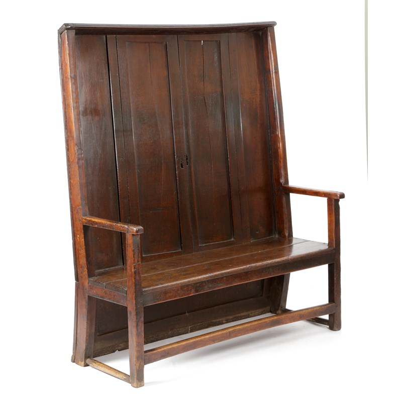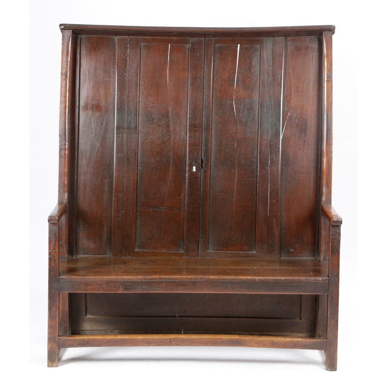 A GEORGE II OAK HIGH BACK 'CANOPY' SETTLE