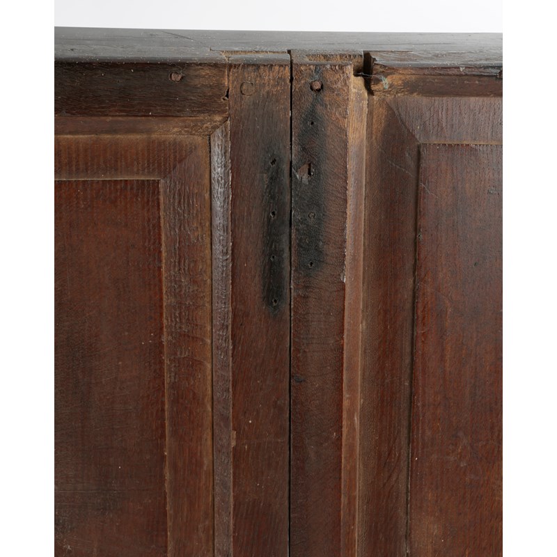 of joined and boarded construction, constructed originally using some reclaimed timbers, the back of four upright panels, below a shallow canopy, with flat open arms on rectangular section supports, descending to front legs, splayed panelled rear below the boarded seat