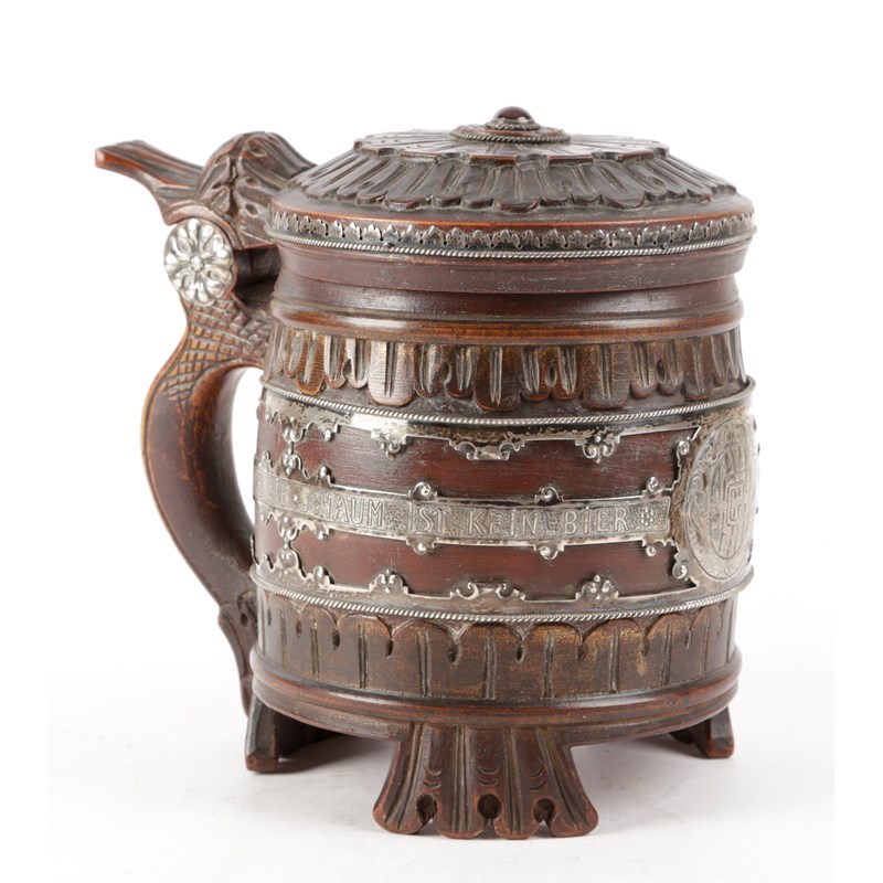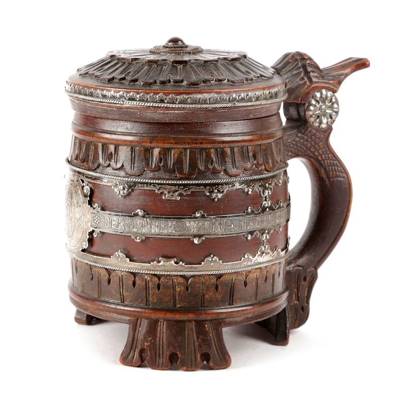 the barrel shaped body with carved stylised foliate decoration above three flared feet beneath a slightly domed hinged cover with a central amethyst coloured cabochon, the mount inscribed 'SIEH DICH FIR SCHAUM IST KEIN BIERDER KUHLE WEIN MACHT GUT LATEIN'