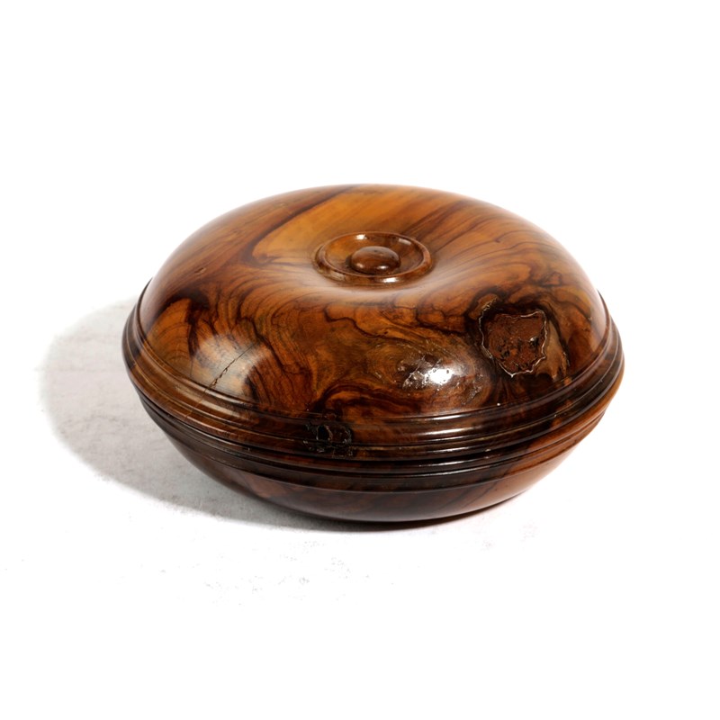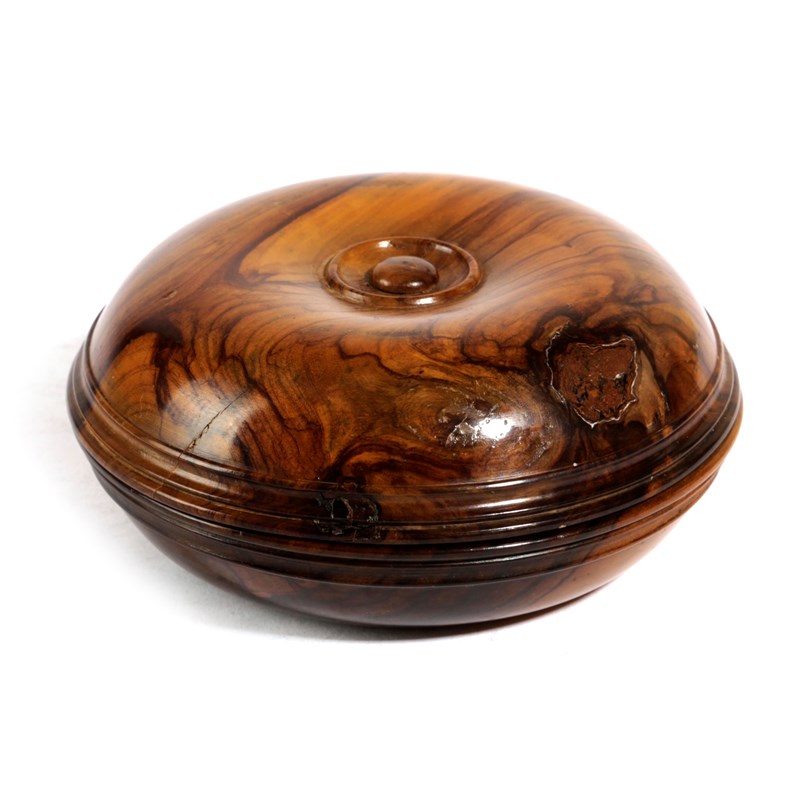 AN EARLY VICTORIAN TREEN OLIVEWOOD 'BRIGHTON BUN' TRAVELLING CANDLEHOLDER