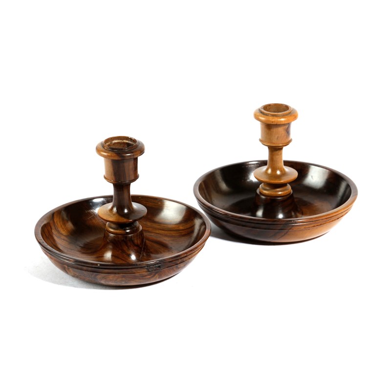 of typical form with decorative ring turnings and paired screw-on candleholders