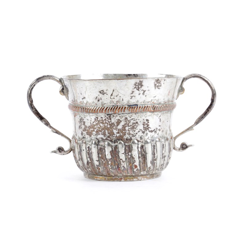 A QUEEN ANNE SILVERED COPPER TWIN-HANDLED GADROONED CUP