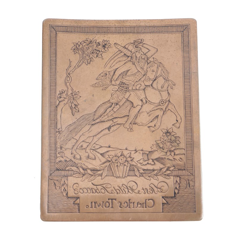 of small rectangular form, designed with a male riding a leaping horse, above a mirror inscription ‘Best Mild Tobacco’ over ‘Charles Town’