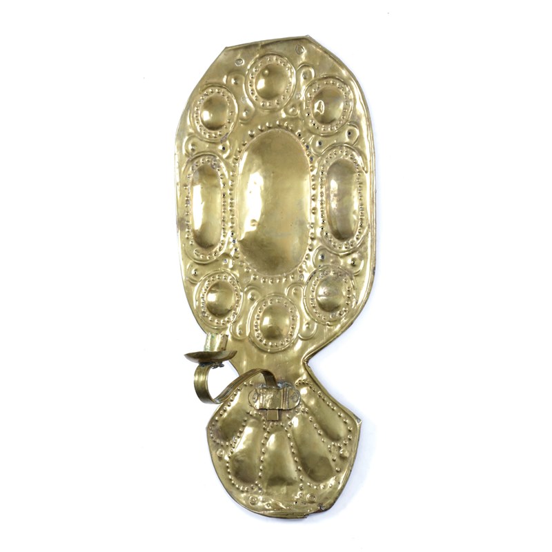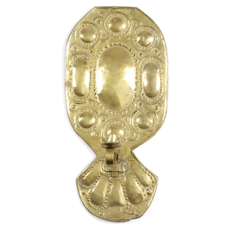 A SHEET BRASS REPOUSSE CANDLE WALL SCONCE