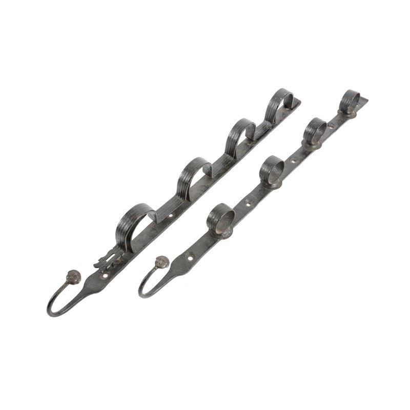 of two straps, one with hinged cover formed of four arches to cover the grip of a gun and secured at the base with a loop for a former padlock, the other strap with four loops to hold the stock, each with hooked terminal with a human face finial (2)