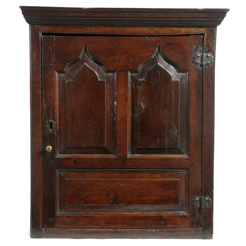 the single door having a pair of fielded and pointed ogee-arched panels, above a horizontal rectangular panel, enclosing a pair of shelves