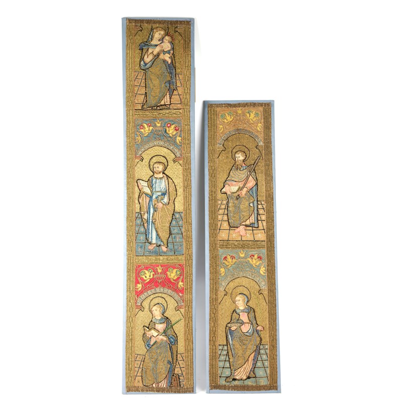 each worked in embroidered, laid and couched metallic and coloured silk threads, with appliqué silk and couched silk cords, one depicting the Madonna and Child, atop St. Peter within a foliate decorated niche, and St. Catherine, the other depicting St. Paul holding a book and sceptre, within a foliate decorated niche, above St. Lucia holding a golden platter bearing two eyes in one hand, a palm branch in the other, mounted (2)