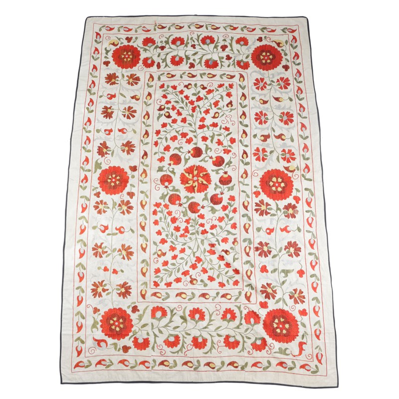worked on a cotton ground in coloured silks, primarily in shades of red, yellow and green, in a typical floral rosette and boteh design worked in sections, backed in a vermillion cotton, edged in black cotton
