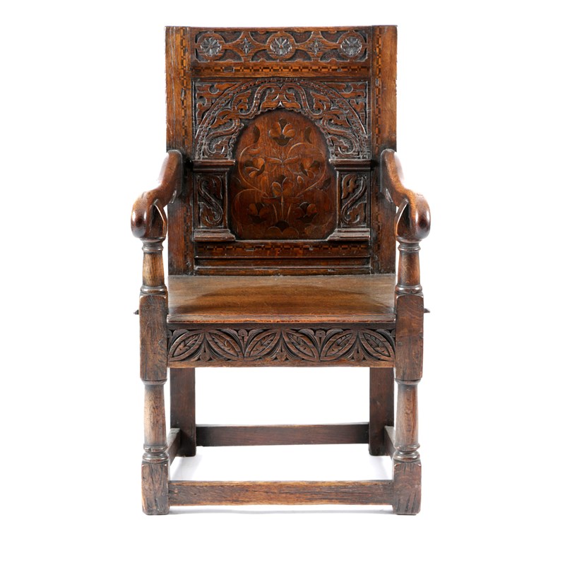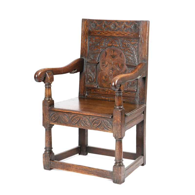 AN OAK AND MARQUETRY PANELLED BACK ARMCHAIR