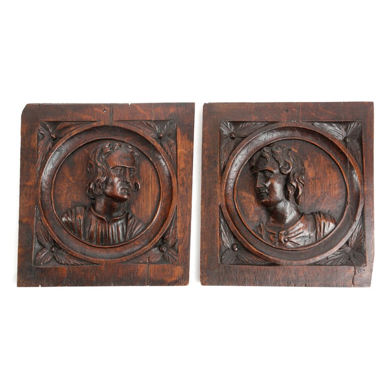 of two male busts, each carved in high relief, within a rondel surround (2)